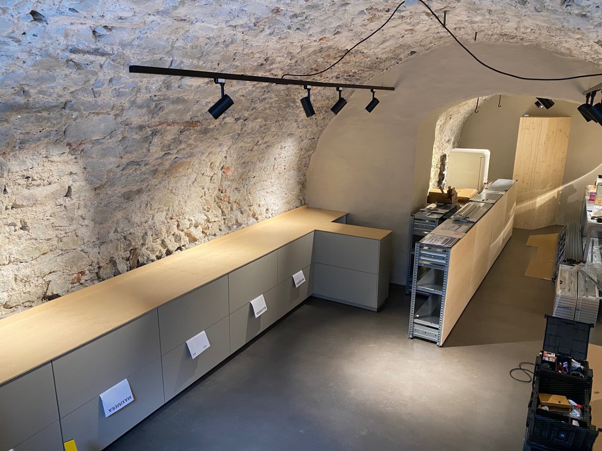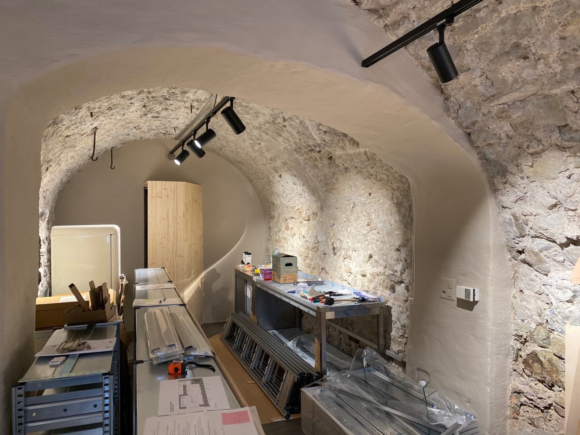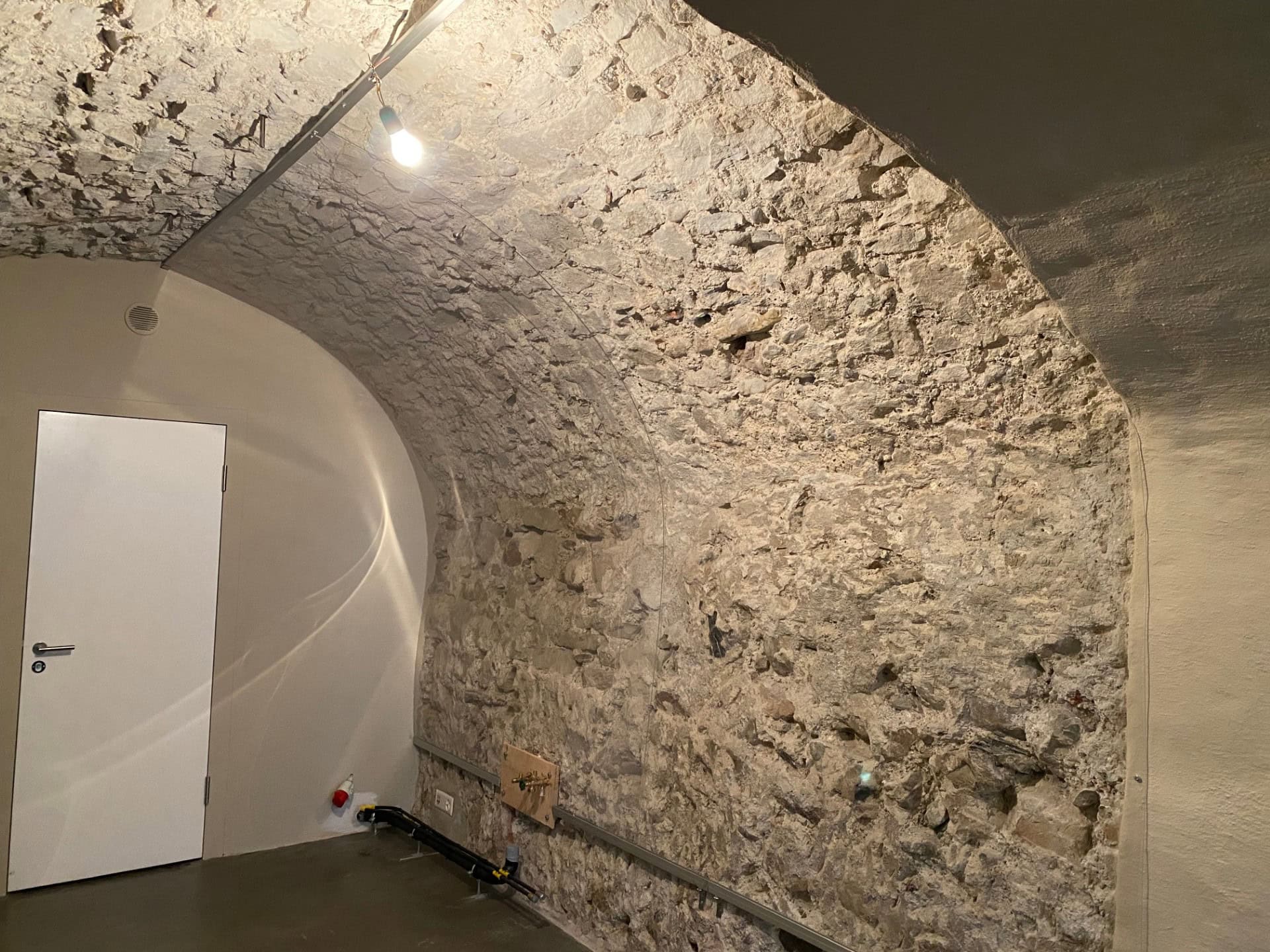 Die Herausforderung: Der historische Steinkeller musste im Bereich über der Arbeitsfläche hygienisch geschützt werden.