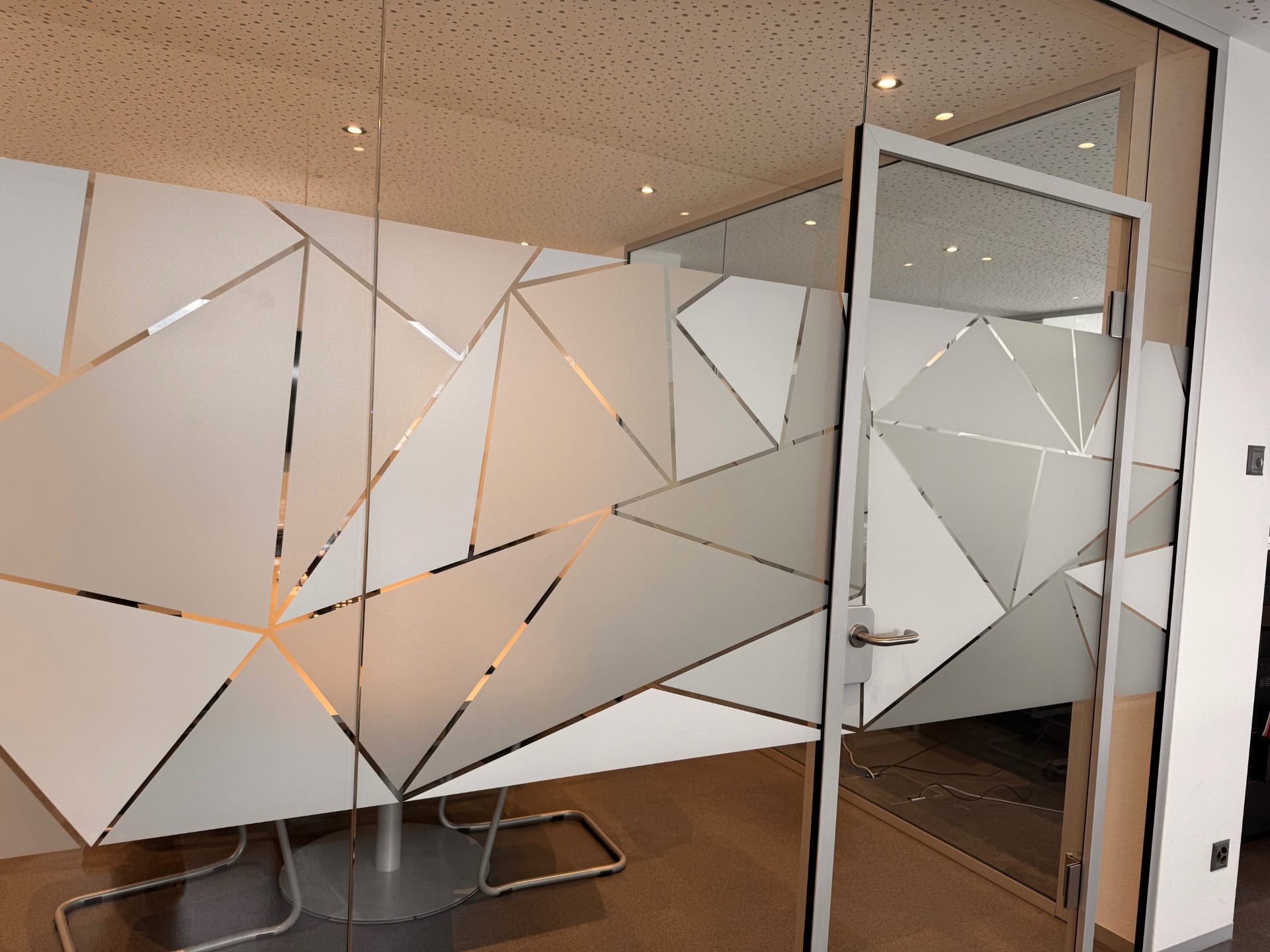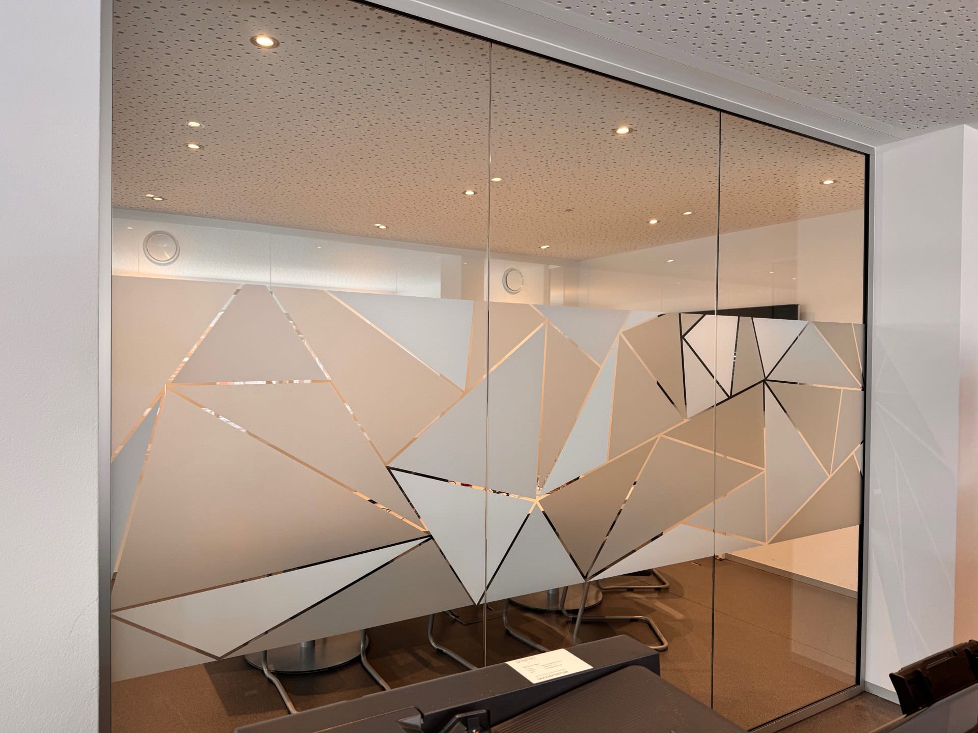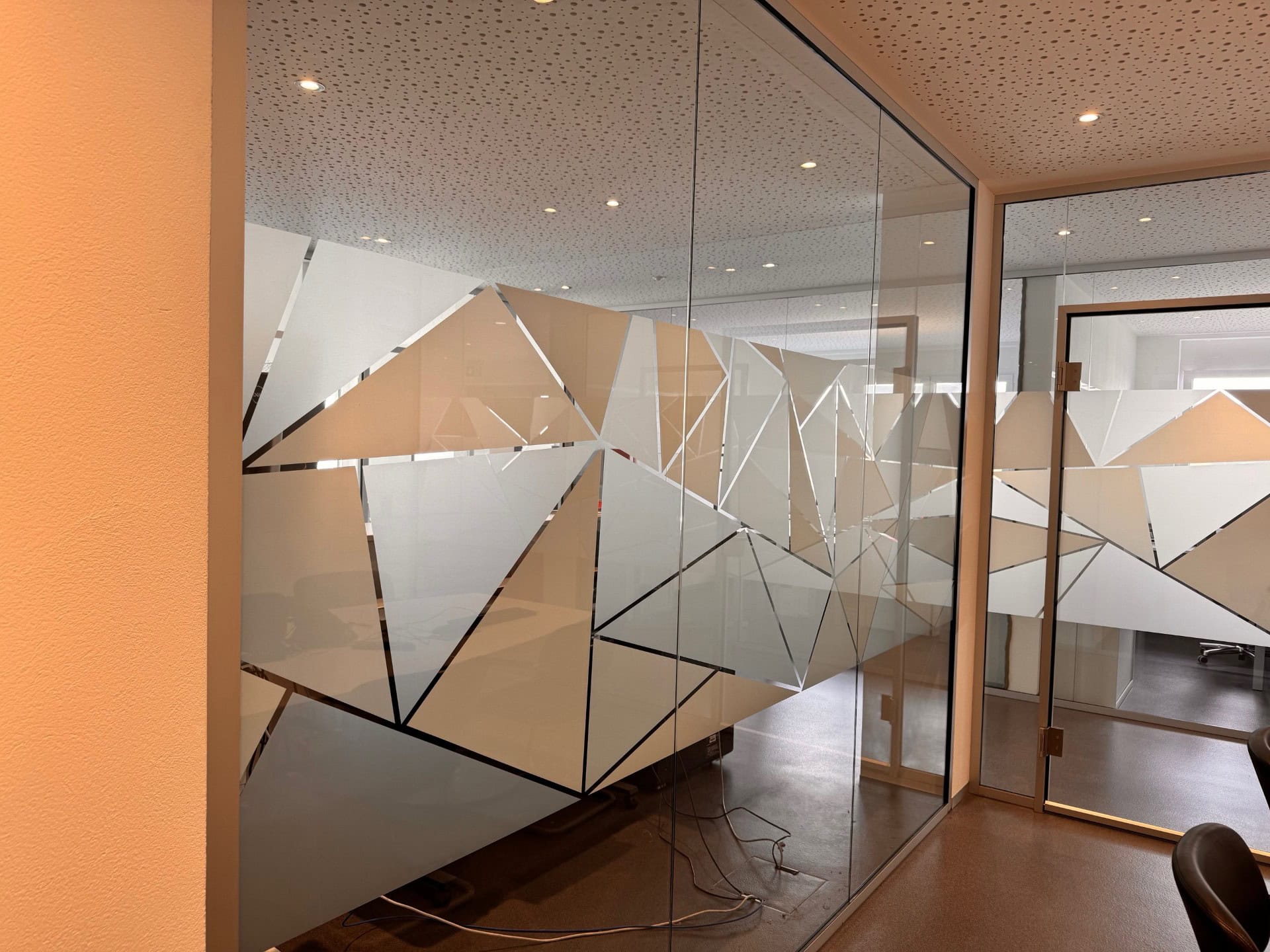 Wir durften eine individuell abgestimmte Glasdekorfolie in verschiedenen Weißtönen drucken, schneiden und fachgerecht montieren.